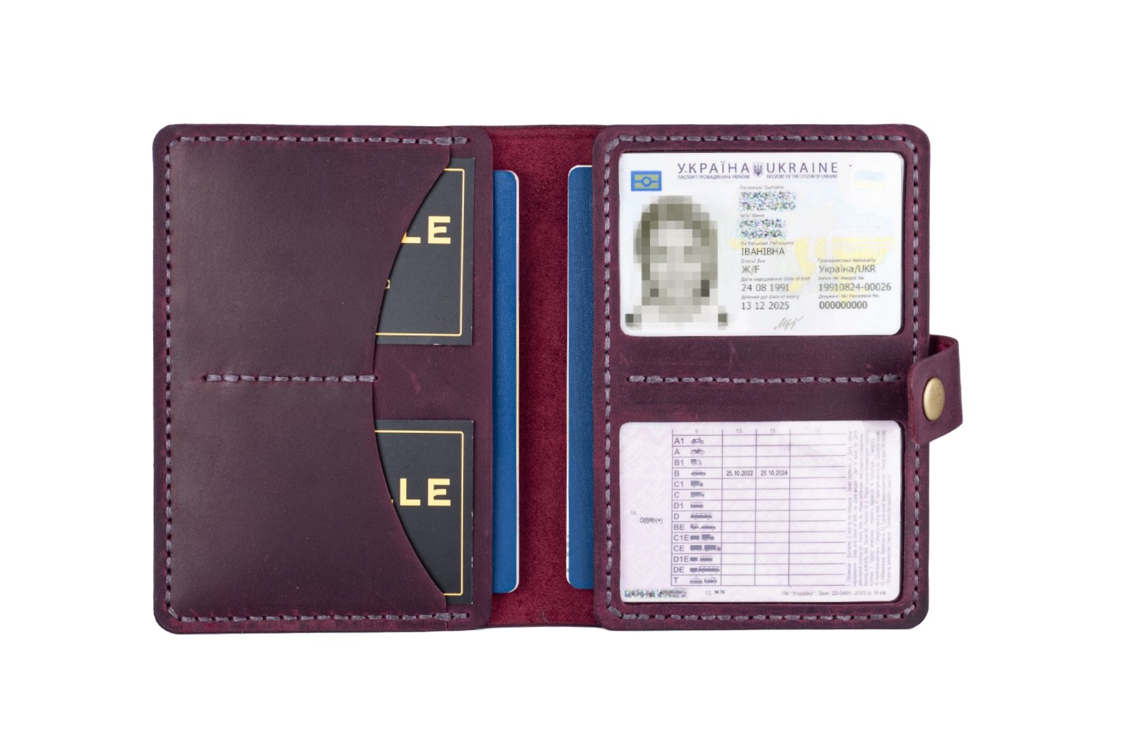Відділи: для паспорта (2 шт), для карт (2 шт), прозорі віконечка (2 шт)