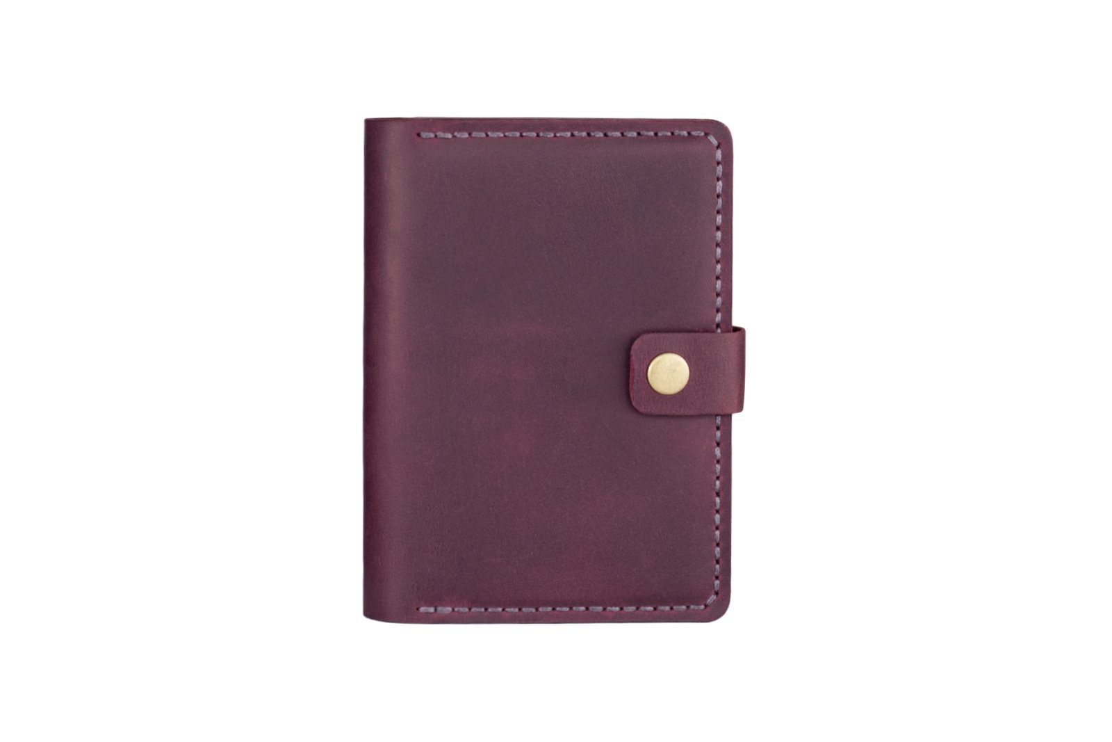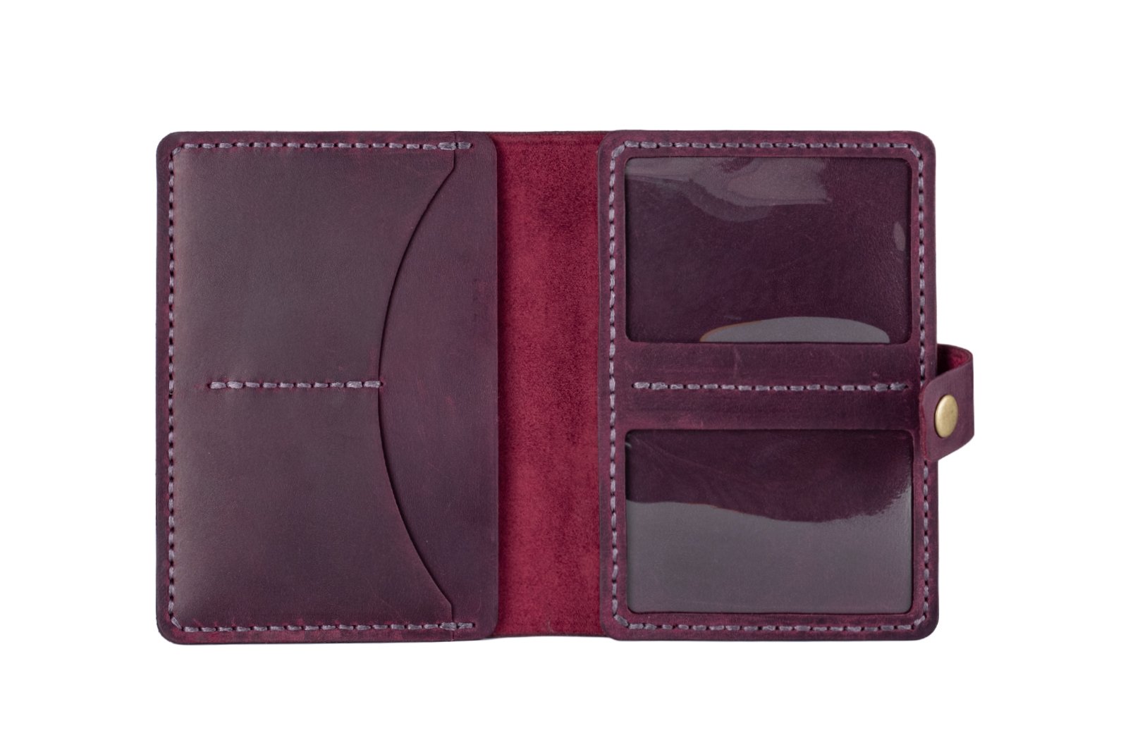 Картхолдер виконаний з натуральної телячої шкіри високої якості та прошитий вручну вощеною ниткою, що забезпечить довговічність виробу. Він має два відділення для паспорта або військового квитка, два відділення для банківських карток та два відділення з прозорими віконечками, в які можна покласти паспорт нового зразка, водійське посвідчення або техпаспорт на авто.